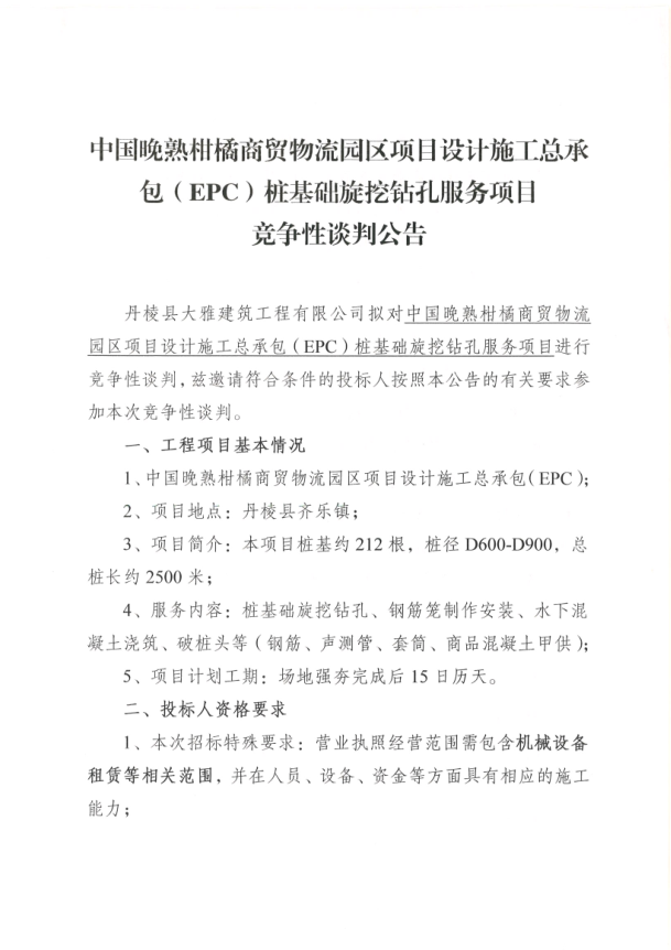 【大雅建筑公司】中國晚熟柑橘商貿(mào)物流園區(qū)項目設計施工總承包(EPC)樁基礎旋挖鉆孔服務項目競爭性談判公告