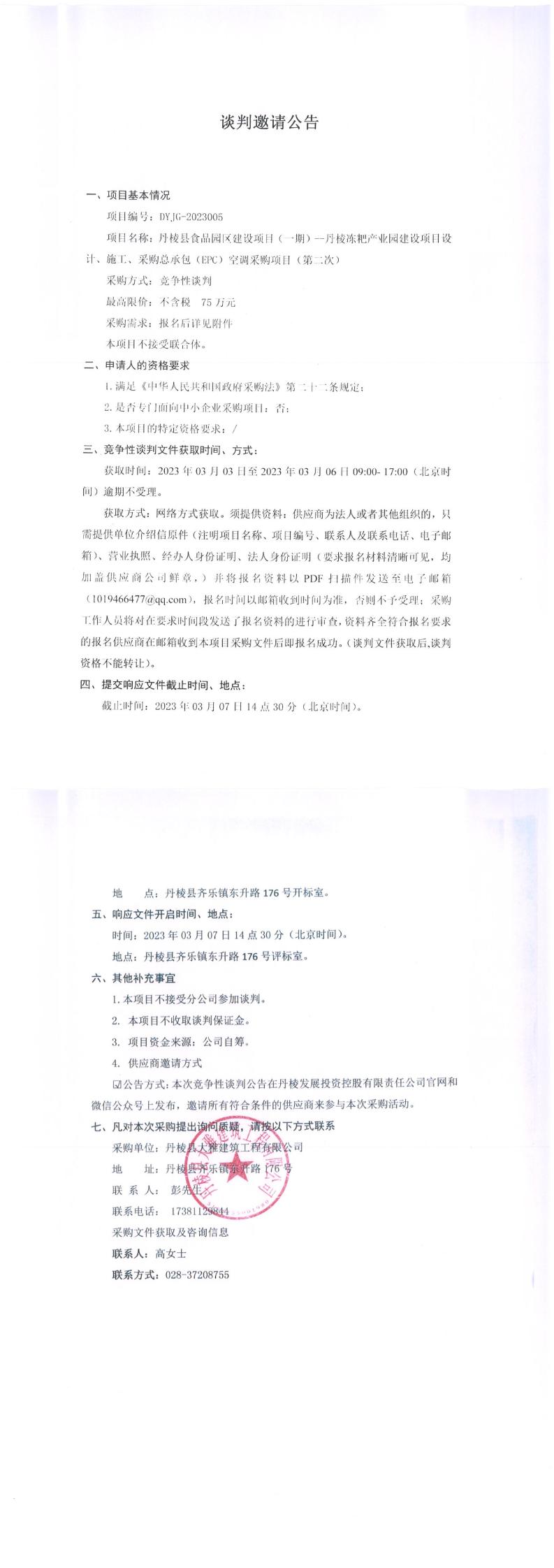 丹棱縣食品園區(qū)建設(shè)項(xiàng)目(一期)--丹棱凍粑產(chǎn)業(yè)園建設(shè)項(xiàng)目設(shè)計(jì)、施工、采購(gòu)總承包(EPC)空調(diào)采購(gòu)項(xiàng)目(第二次)談判邀請(qǐng)公告