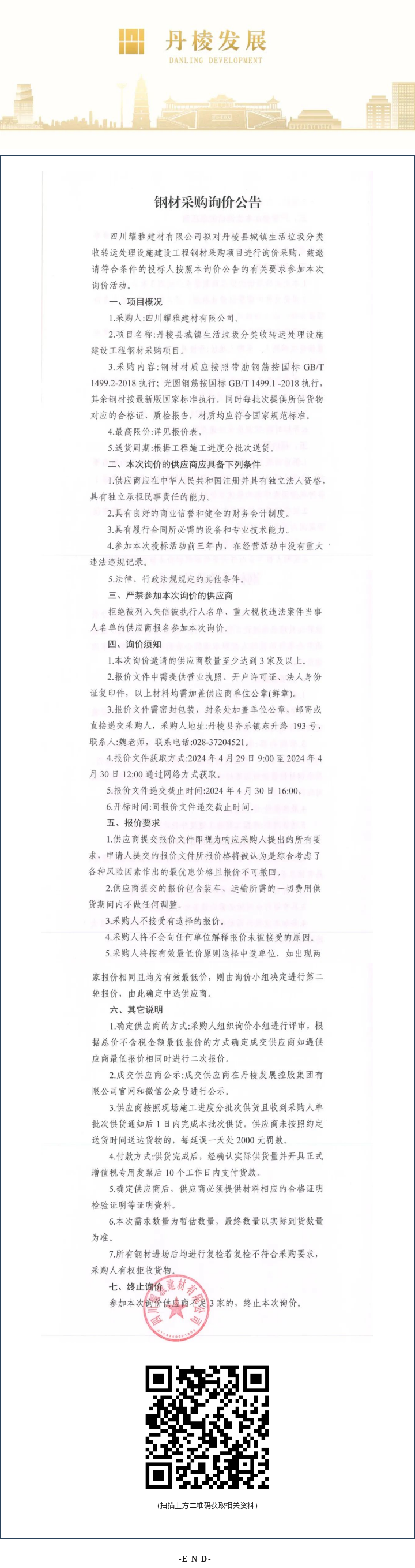 丹棱縣城鎮(zhèn)生活垃圾分類收轉(zhuǎn)運(yùn)處理設(shè)施建設(shè)工程鋼材采購項(xiàng)目詢價(jià)公告