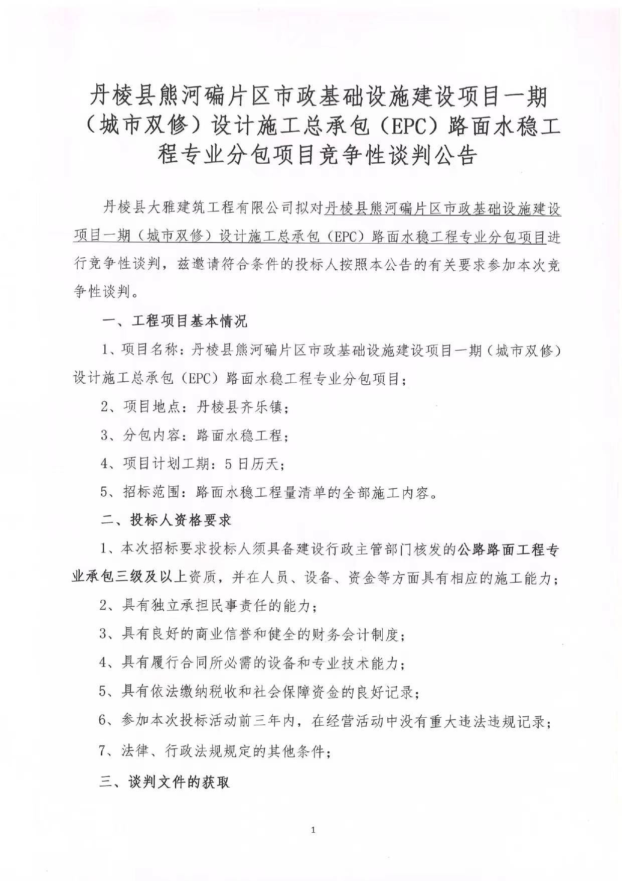 丹棱縣熊河碥片區(qū)市政基礎設施建設項目一期(城市雙修)設計施工總承包(EPC)路面水穩(wěn)工 程專業(yè)分包項目競爭性談判公告