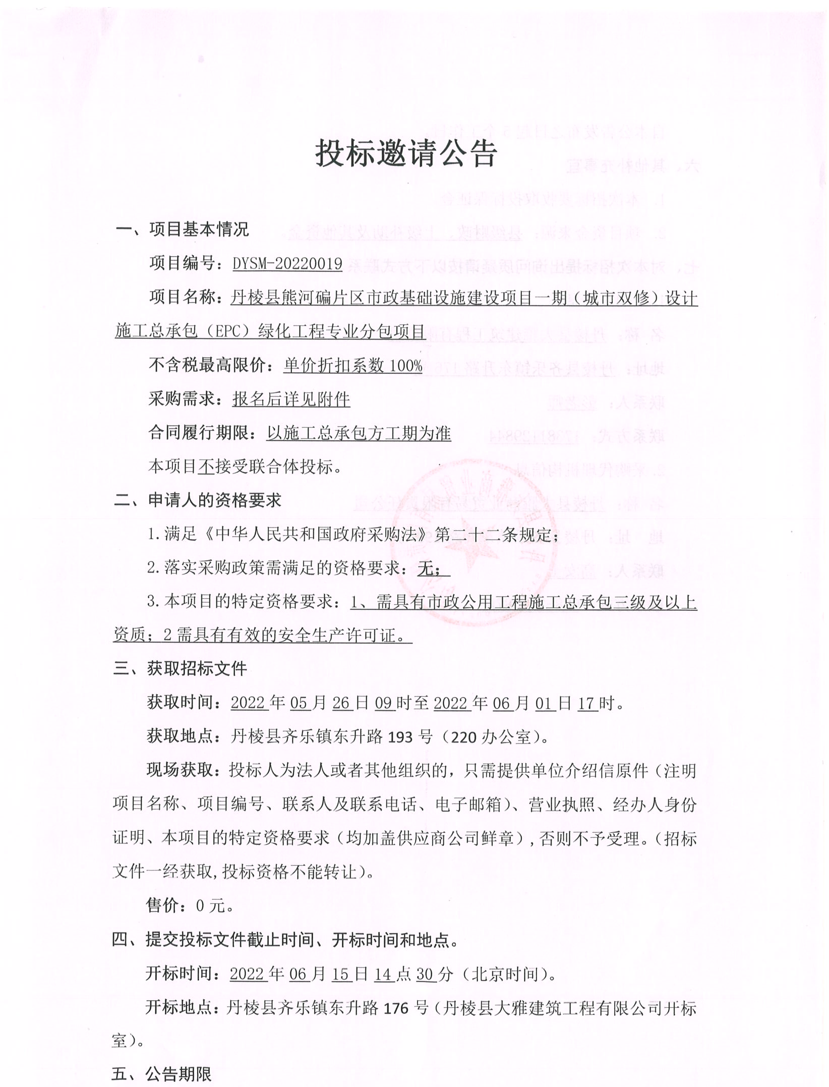 丹棱縣熊河碥片區(qū)市政基礎(chǔ)設(shè)施建設(shè)項(xiàng)目一期(城市雙修)設(shè)計(jì)施工總承包(EPC)綠化工程專業(yè)分包項(xiàng)目投標(biāo)邀請(qǐng)公告
