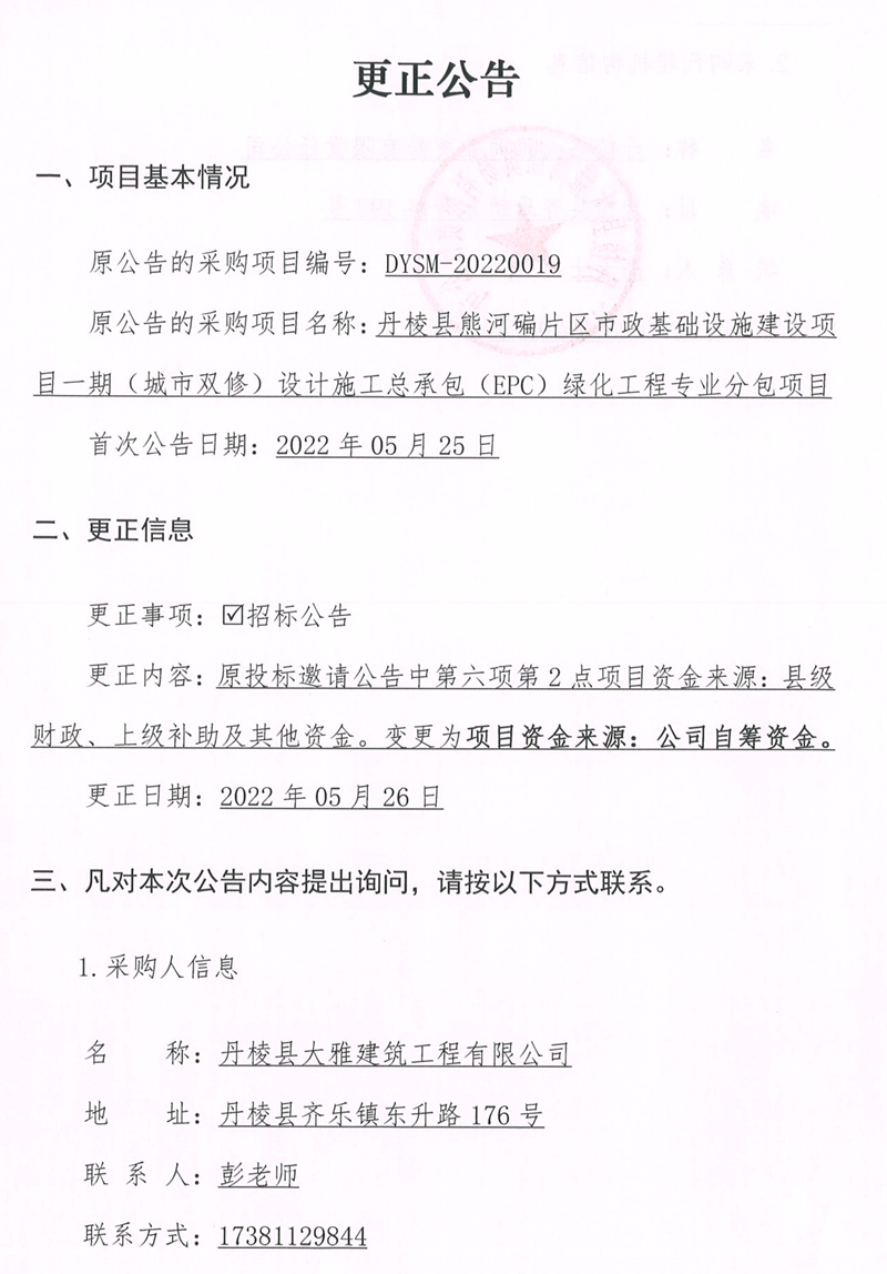 丹棱縣熊河碥片區(qū)市政基礎(chǔ)設(shè)施建設(shè)項目一期(城市雙修)設(shè)計施工總承包(EPC)綠化工程專業(yè)分包項目更正公告