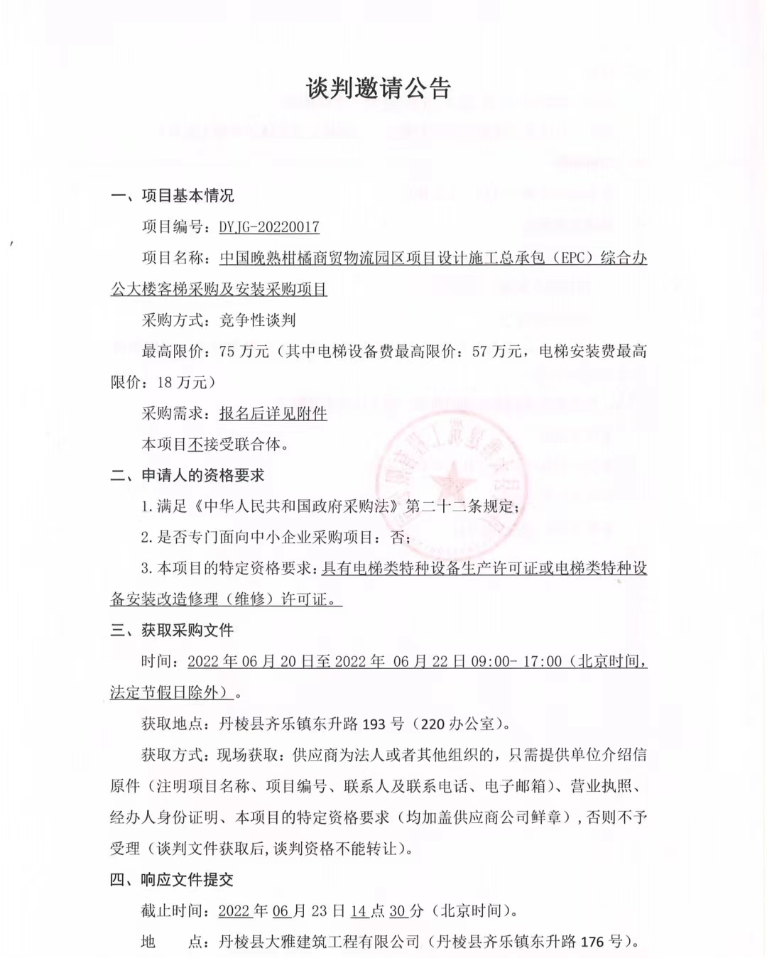 中國晚熟柑橘商貿(mào)物流園區(qū)項目設計施工總承包(EPC)綜合辦公大樓客梯采購及安裝采購項目談判邀請公告