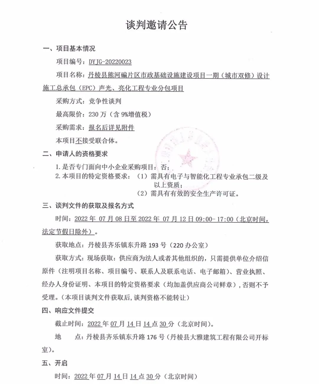 丹棱縣熊河碥片區(qū)市政基礎設施建設一期(城市雙修)設計施工總承包(EPC)聲光、亮化工程專業(yè)分包項目談判邀請公告