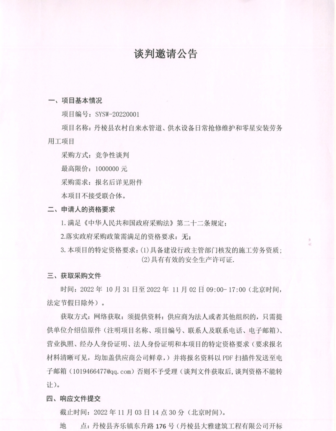 丹棱縣農(nóng)村自來水管道、供水設(shè)備日常搶修維護(hù)和零星安裝勞務(wù)用工項(xiàng)目談判邀請公告