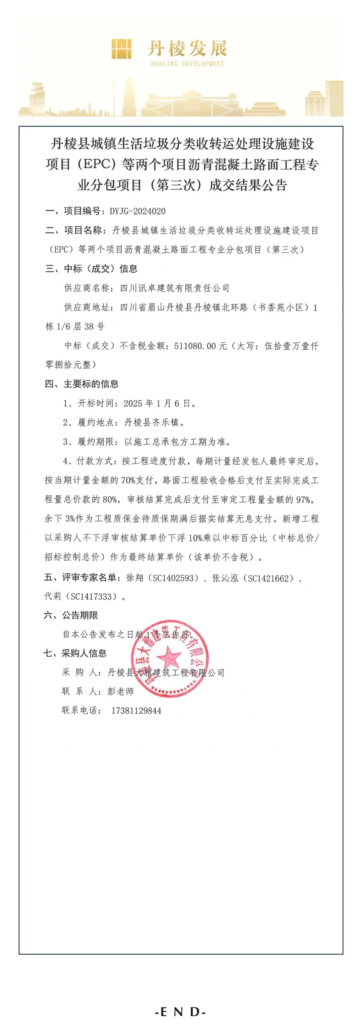 丹棱縣城鎮(zhèn)生活垃圾分類收轉(zhuǎn)運(yùn)處理設(shè)施建設(shè)項(xiàng)目(EPC)等兩個(gè)項(xiàng)目瀝青混凝土路面工程專業(yè)分包項(xiàng)目(第三次)成交結(jié)果公告