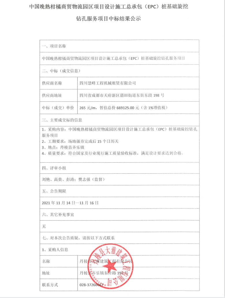 【大雅建筑公司】中國晚熟柑橘商貿(mào)物流園區(qū)項目設(shè)計施工總承包(EPC)樁基礎(chǔ)旋挖鉆孔服務(wù)項目中標結(jié)果公示