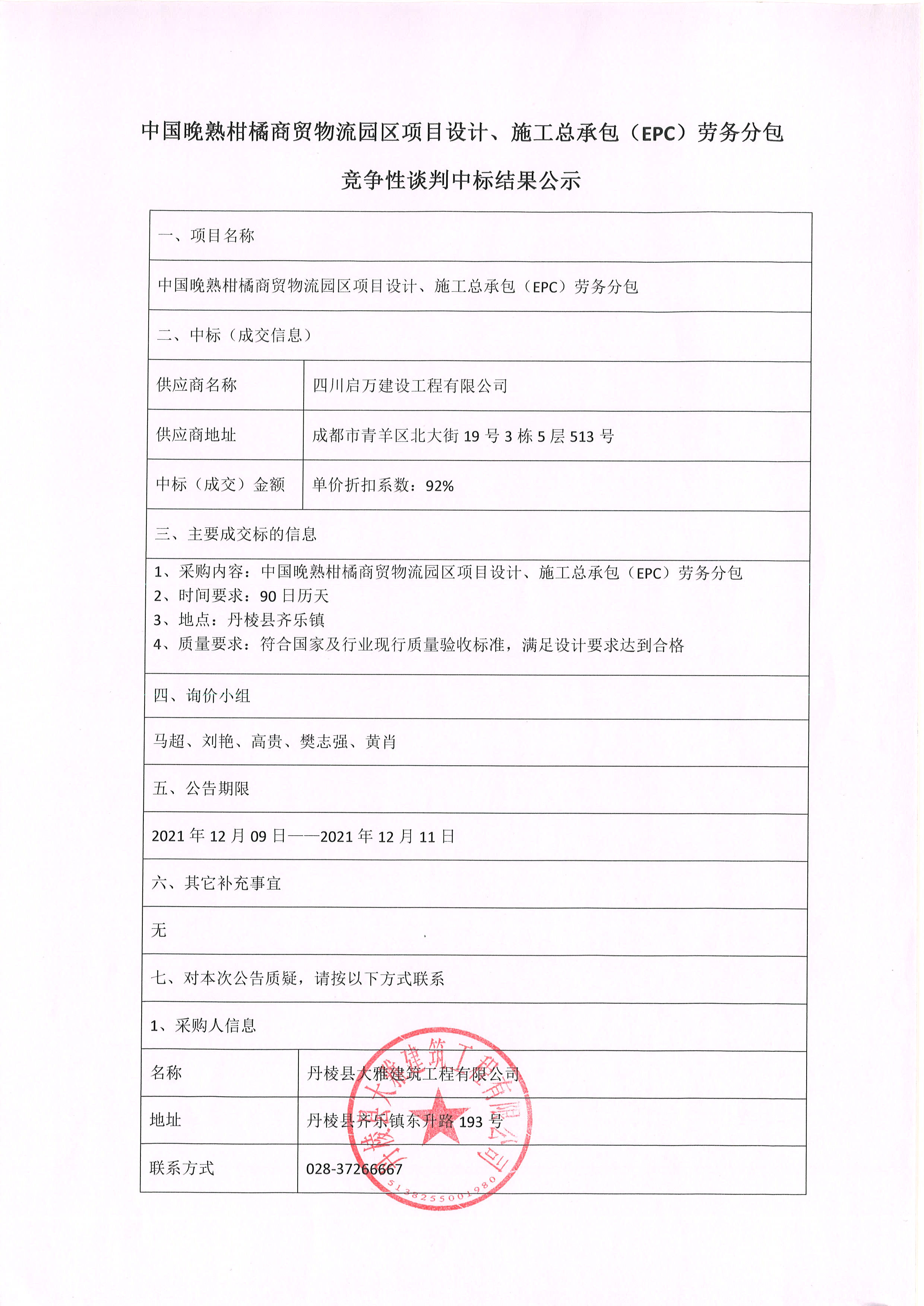【大雅建筑公司】中國晚熟柑橘商貿(mào)物流園區(qū)項目設(shè)計、施工總承包(EPC)勞務(wù)分包競爭性談判中標(biāo)結(jié)果公示