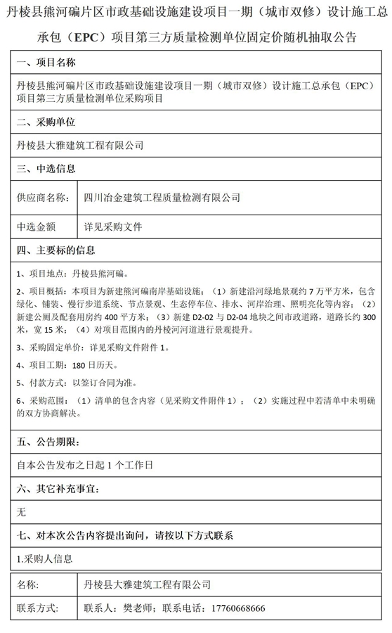 丹棱縣熊河碥片區(qū)市政基礎(chǔ)設(shè)施建設(shè)項(xiàng)目一期(城市雙修)設(shè)計(jì)施工總承包(EPC)項(xiàng)目第三方質(zhì)量檢測單位固定價(jià)隨機(jī)抽取公告