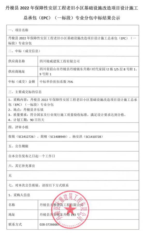 丹棱縣2022年保障性安居工程老舊小區(qū)基礎(chǔ)設(shè)施改造項目設(shè)計施工總承包(EPC)(一標段)專業(yè)分包中標結(jié)果公示
