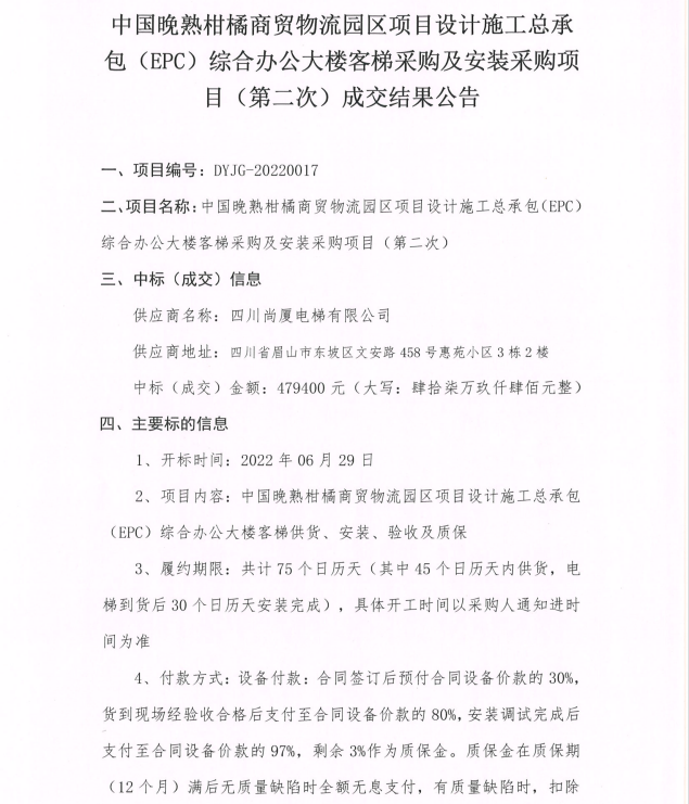 中國晚熟柑橘商貿(mào)物流園區(qū)項(xiàng)目設(shè)計(jì)施工總承包(EPC)綜合辦公大樓客梯采購及安裝采購項(xiàng)目(第二次)成交結(jié)果公告