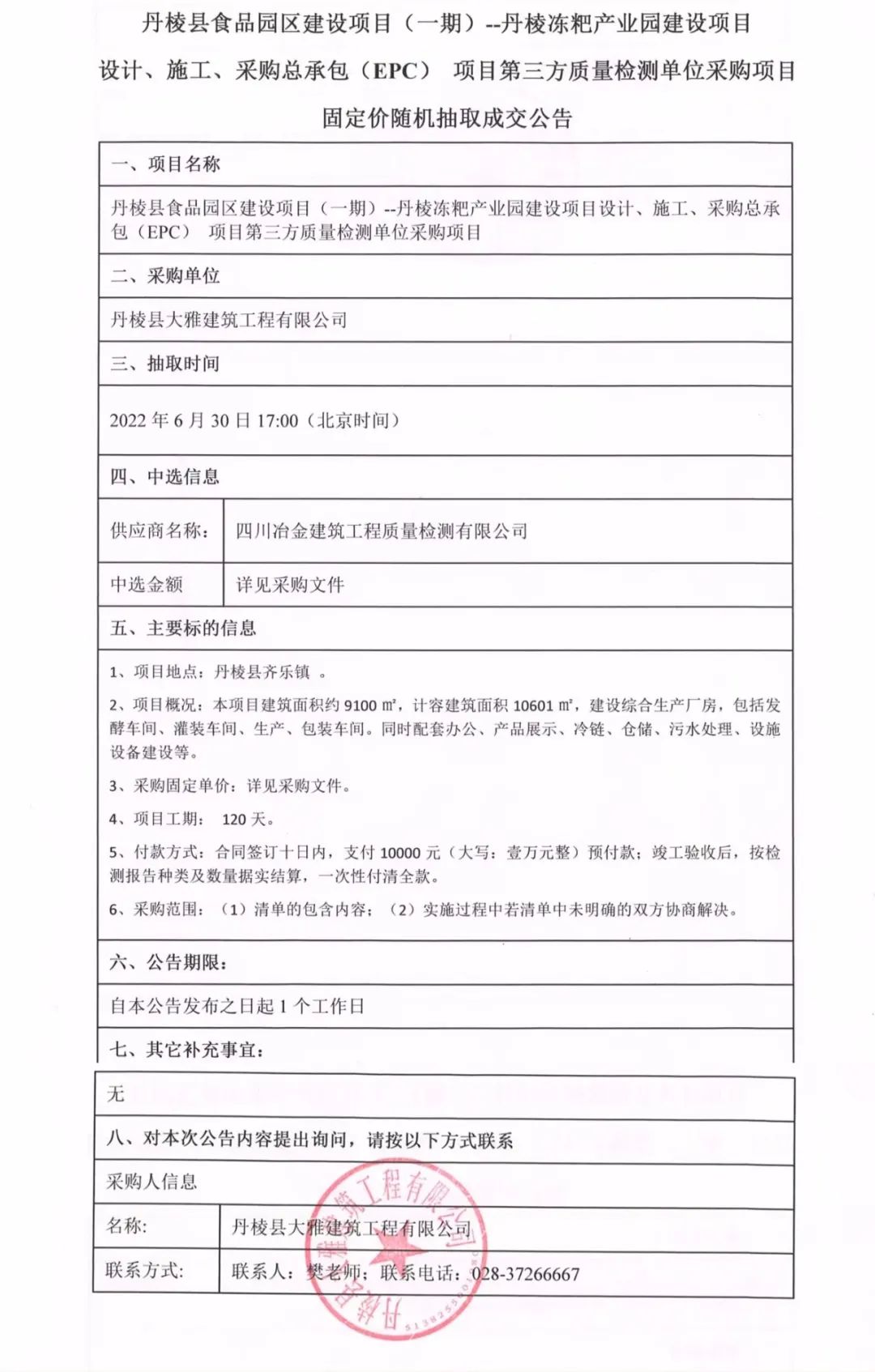 丹棱凍粑產(chǎn)業(yè)園建設(shè)項目設(shè)計、施工、采購總承包(EPC)項目第三方質(zhì)量檢測單位采購項目固定價隨機抽取成交公告