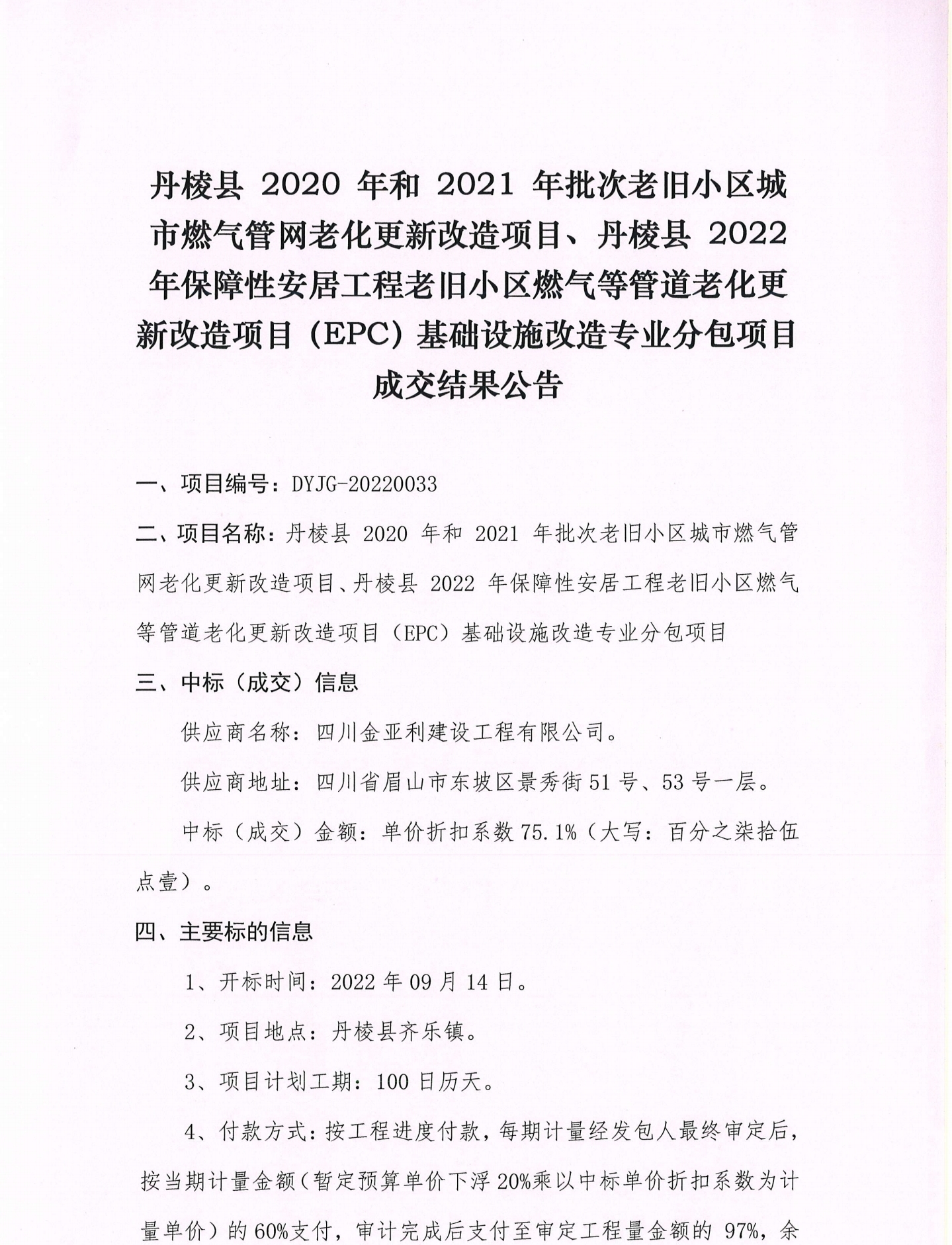 丹棱縣2020年和2021年批次老舊小區(qū)城市燃氣管網(wǎng)老化更新改造項目、丹棱縣2022年保障性安居工程老舊小區(qū)燃氣等管道老化更新改造項目(EPC)基礎設施改造專業(yè)分包項目 成交結(jié)果公告