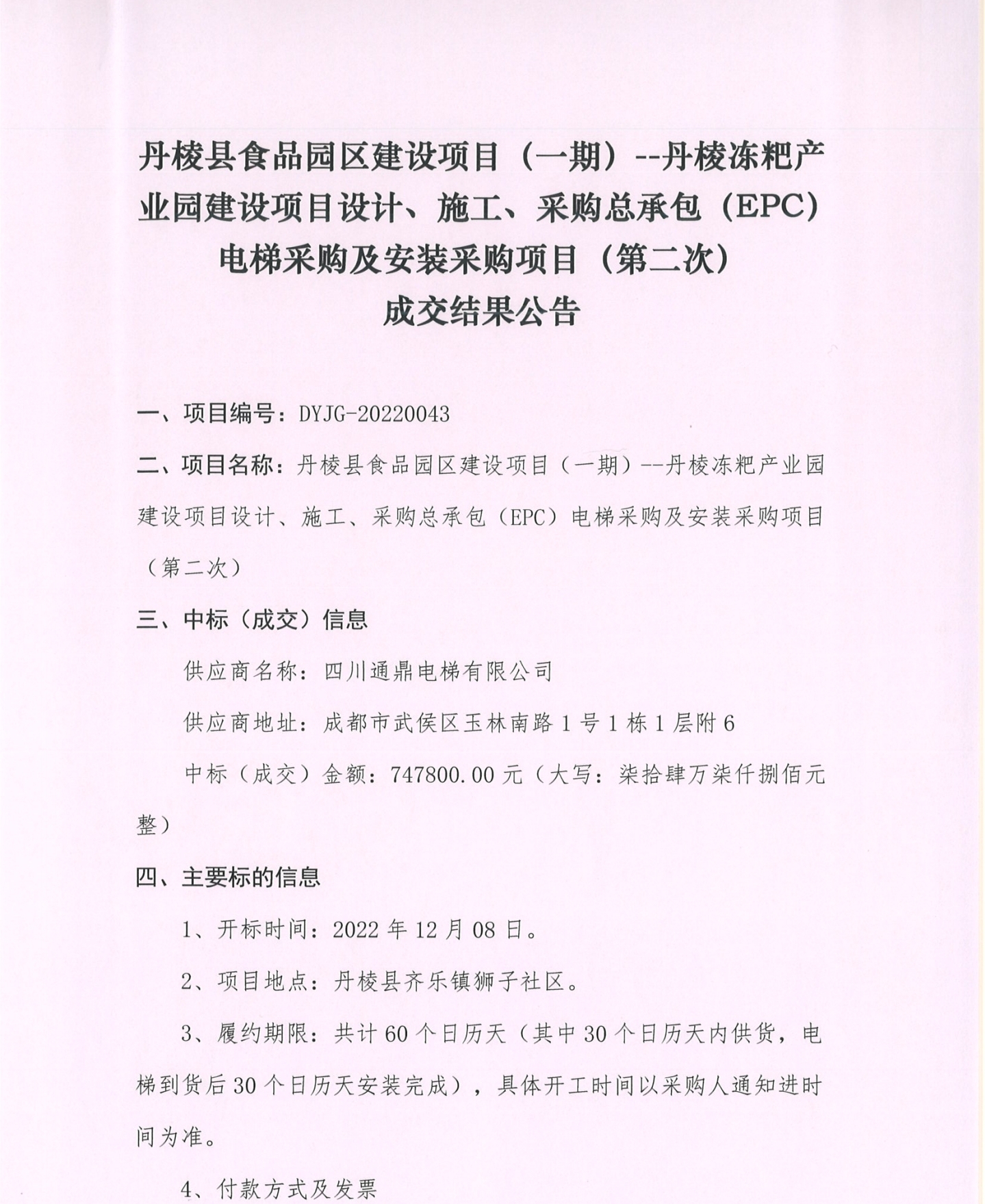 丹梭縣食品園區(qū)建設(shè)項(xiàng)目 (一期) --丹棱凍粑產(chǎn)業(yè)園建設(shè)項(xiàng)目設(shè)計(jì)、施工、采購總承包 (EPC)電梯采購及安裝采購項(xiàng)目 (第二次)成交結(jié)果公告