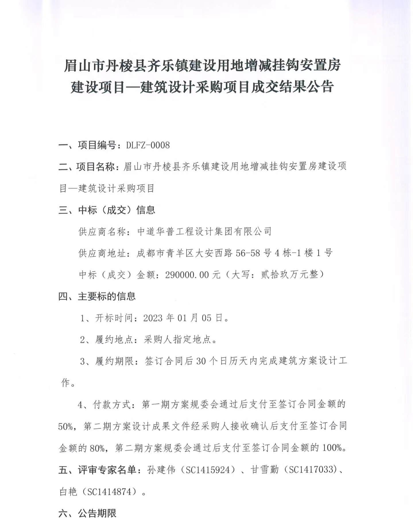 眉山市丹棱縣齊樂(lè)鎮(zhèn)建設(shè)用地增減掛鉤安置房建設(shè)項(xiàng)目--建筑設(shè)計(jì)采購(gòu)項(xiàng)目成交結(jié)果公告