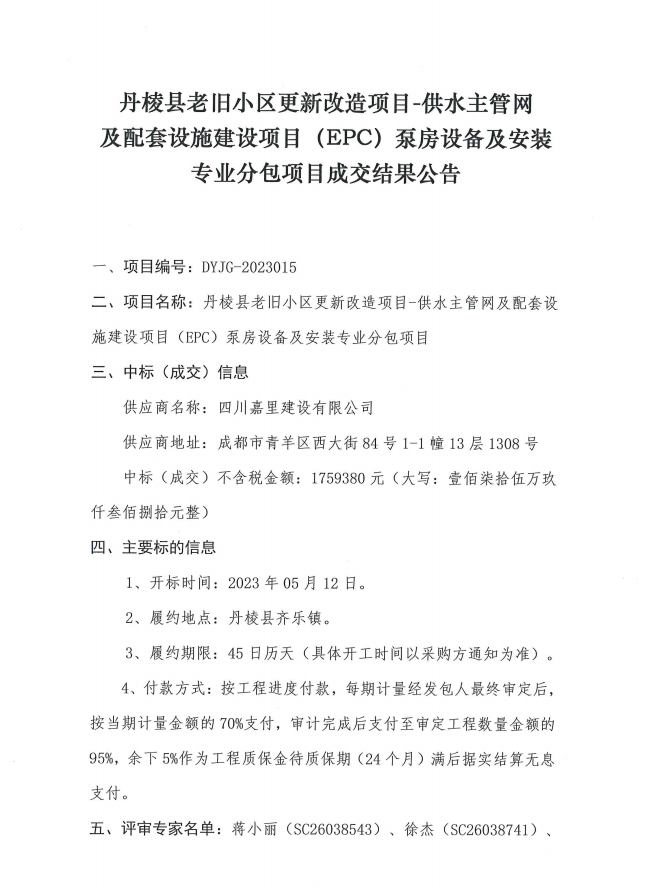 丹棱縣老舊小區(qū)更新改造項目-供水主管網(wǎng)及配套設(shè)施建設(shè)項目(EPC)泵房設(shè)備及安裝專業(yè)分包項目成交結(jié)果公告