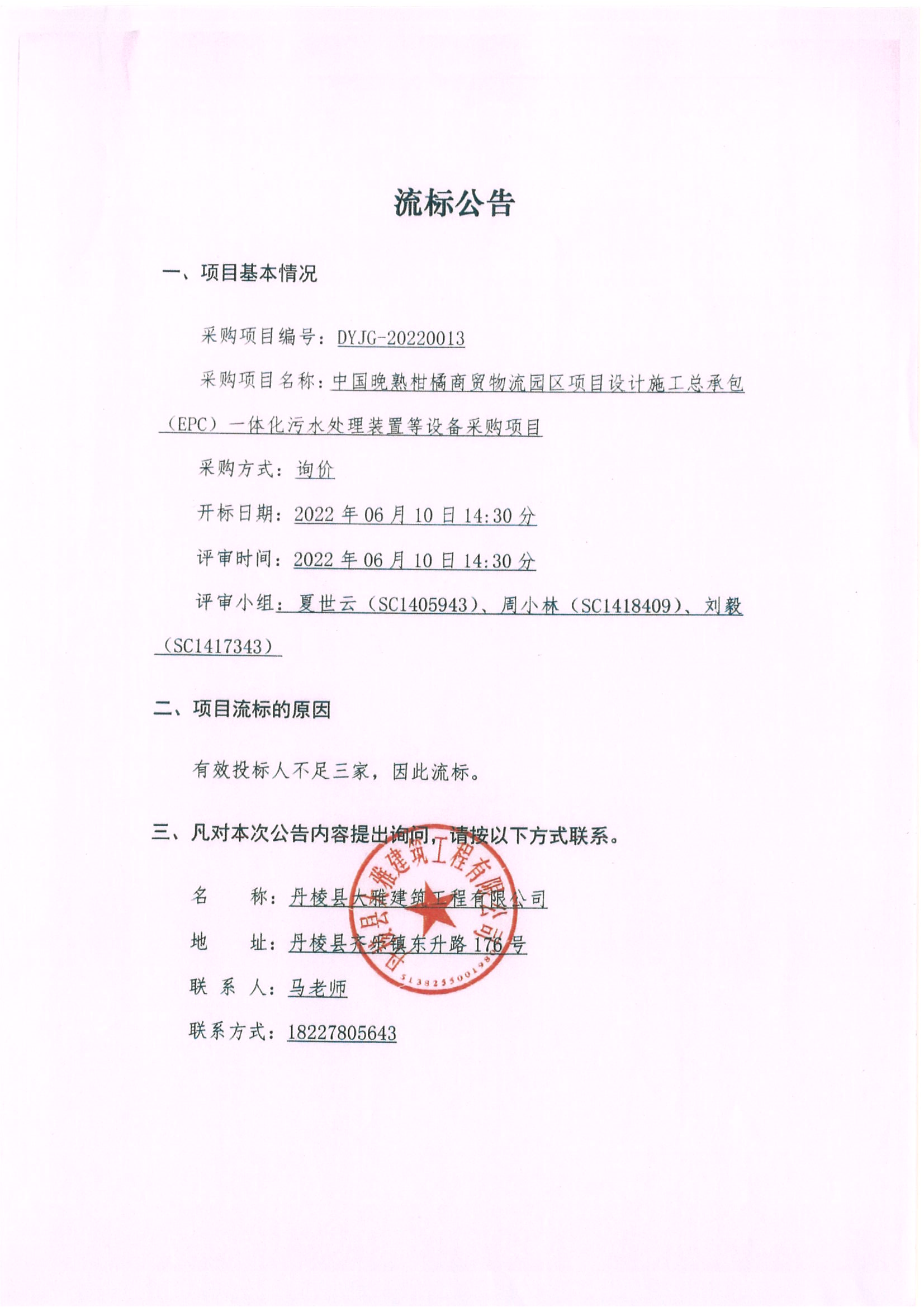 中國晚熟柑橘商貿(mào)物流園區(qū)項(xiàng)目設(shè)計(jì)施工總承包(EPC)一體化污水處理裝置等設(shè)備采購項(xiàng)目流標(biāo)公告