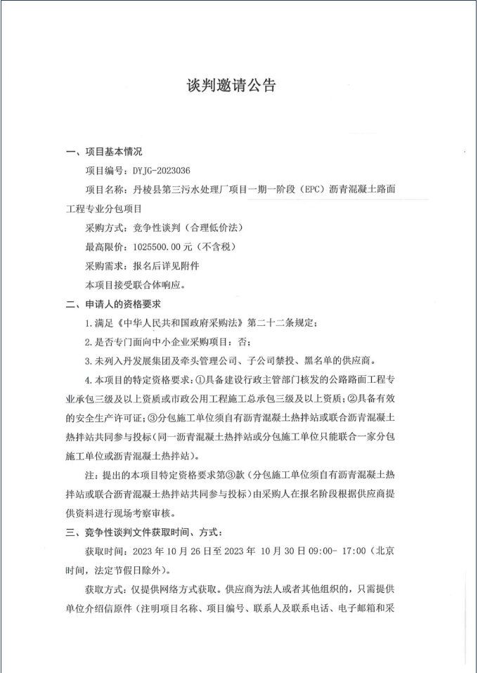 丹棱縣第三污水處理廠項(xiàng)目一期一階段(EPC)瀝青混凝土路面工程專(zhuān)業(yè)分包項(xiàng)目談判邀請(qǐng)公告