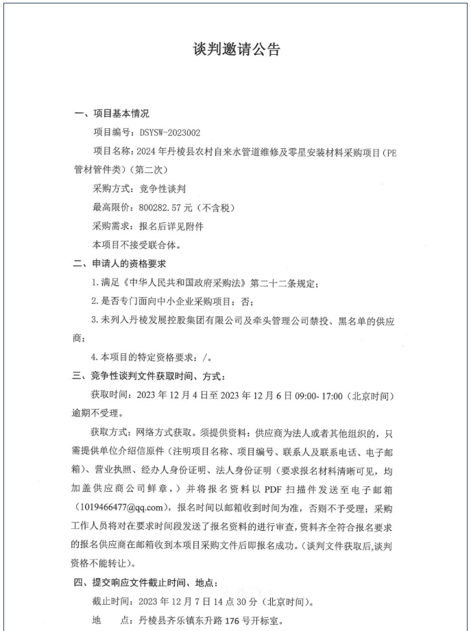 2024年丹棱縣農(nóng)村自來(lái)水管道維修及零星安裝材料采購(gòu)項(xiàng)目(PE管材管件類(lèi))(第二次)談判邀請(qǐng)公告