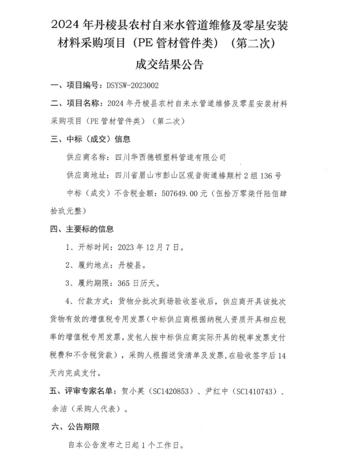 2024年丹棱縣農(nóng)村自來(lái)水管道維修及零星安裝材料采購(gòu)項(xiàng)目(PE管材管件類)(第二次)成交結(jié)果公告