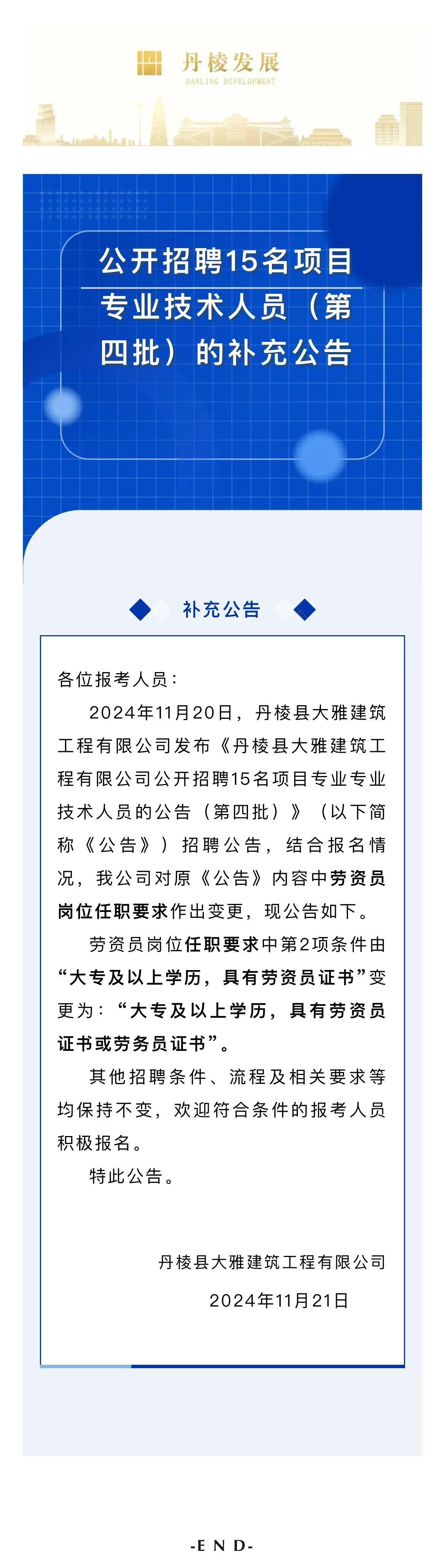 丹棱縣大雅建筑工程有限公司關(guān)于公開(kāi)招聘15名項(xiàng)目專業(yè)技術(shù)人員(第四批)的補(bǔ)充公告