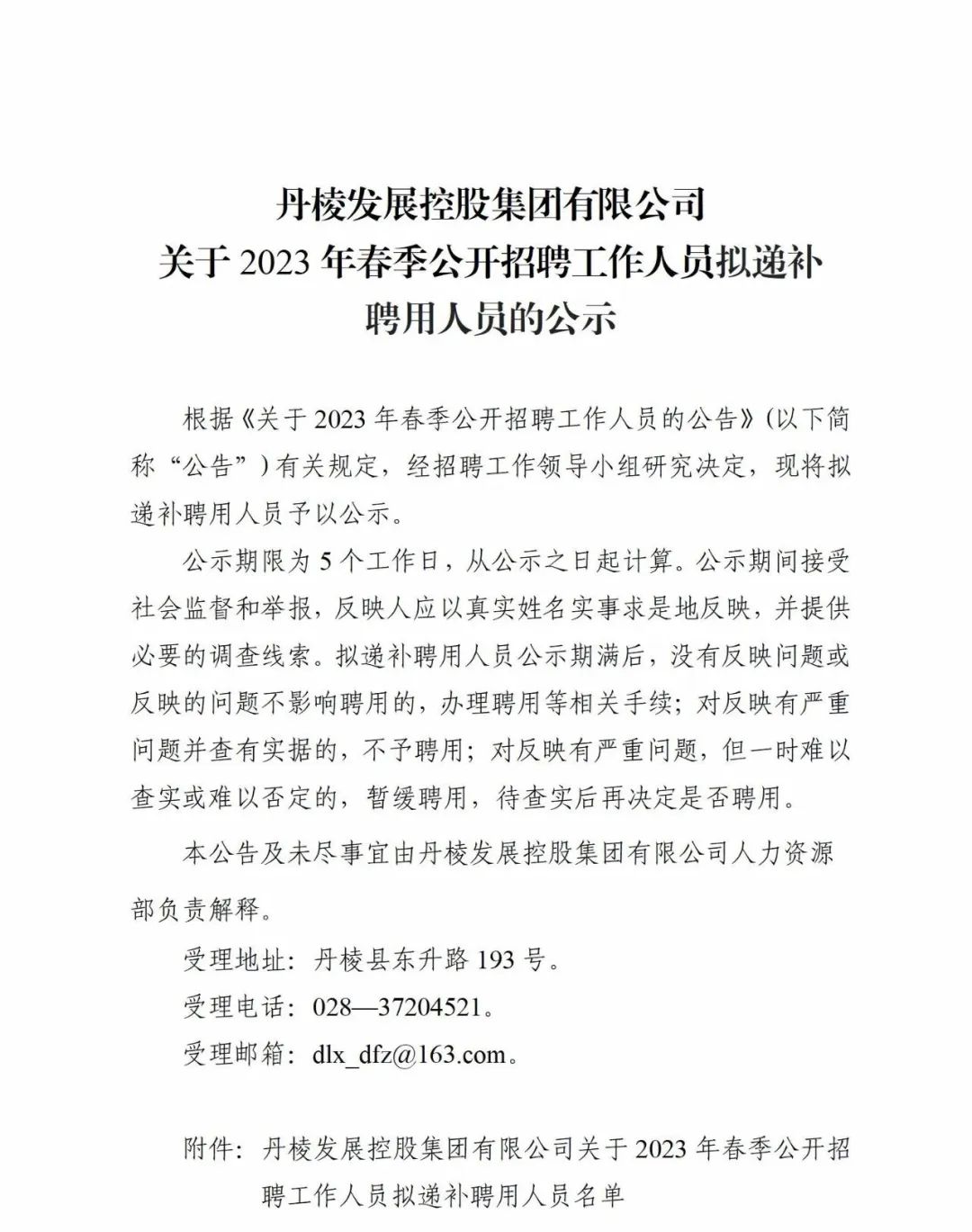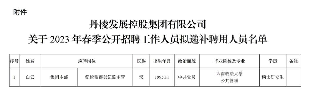 丹棱發(fā)展控股集團(tuán)有限公司關(guān)于2023年春季公開招聘工作人員擬遞補(bǔ)聘用人員的公示